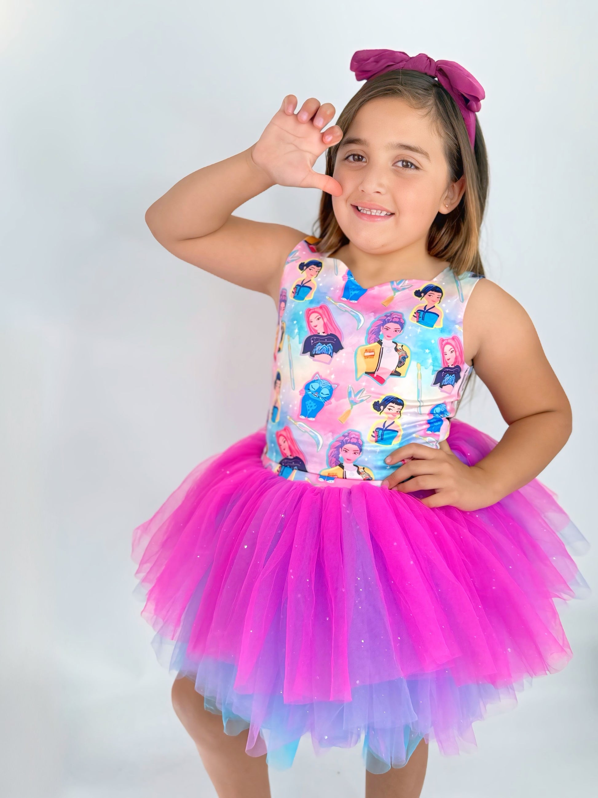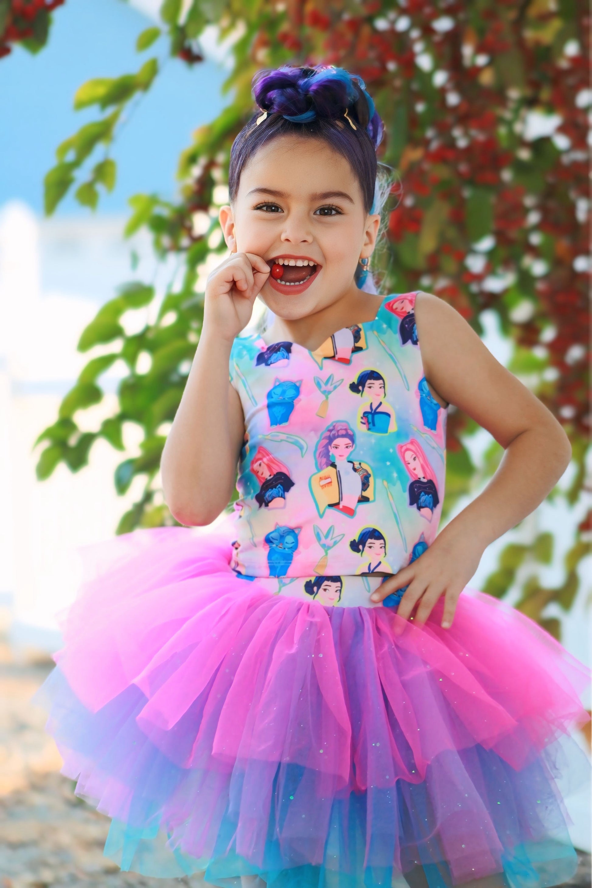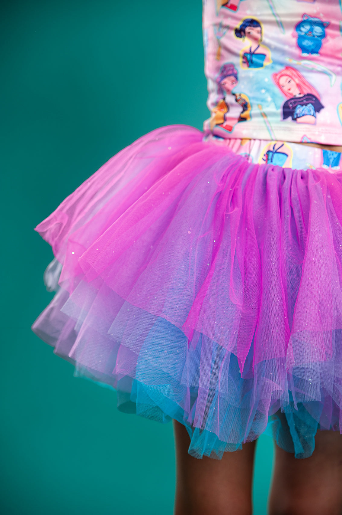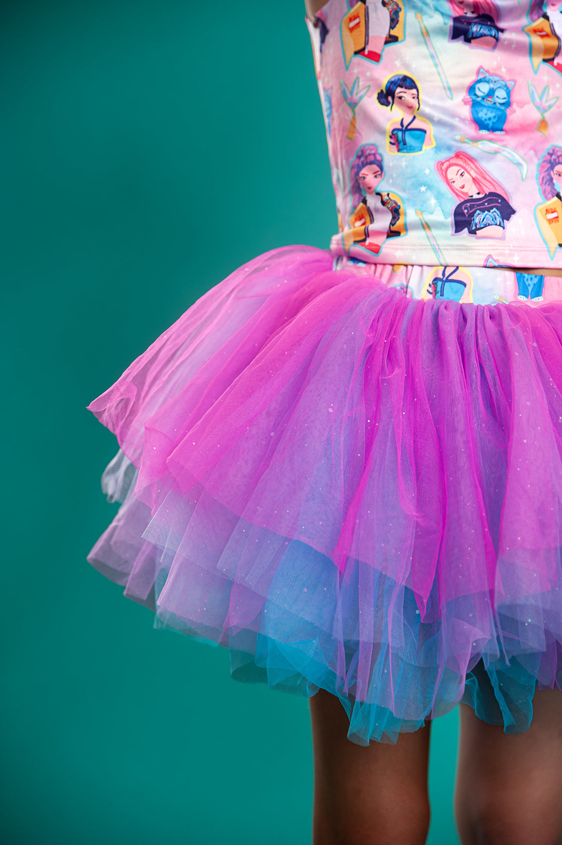 A voluminous tutu skirt crafted from multiple layers of high-quality, soft tulle with printed glitter (no shedding). The elastic waistband ensures a comfortable fit, and soft shorts are included underneath for full coverage and ease of movement.