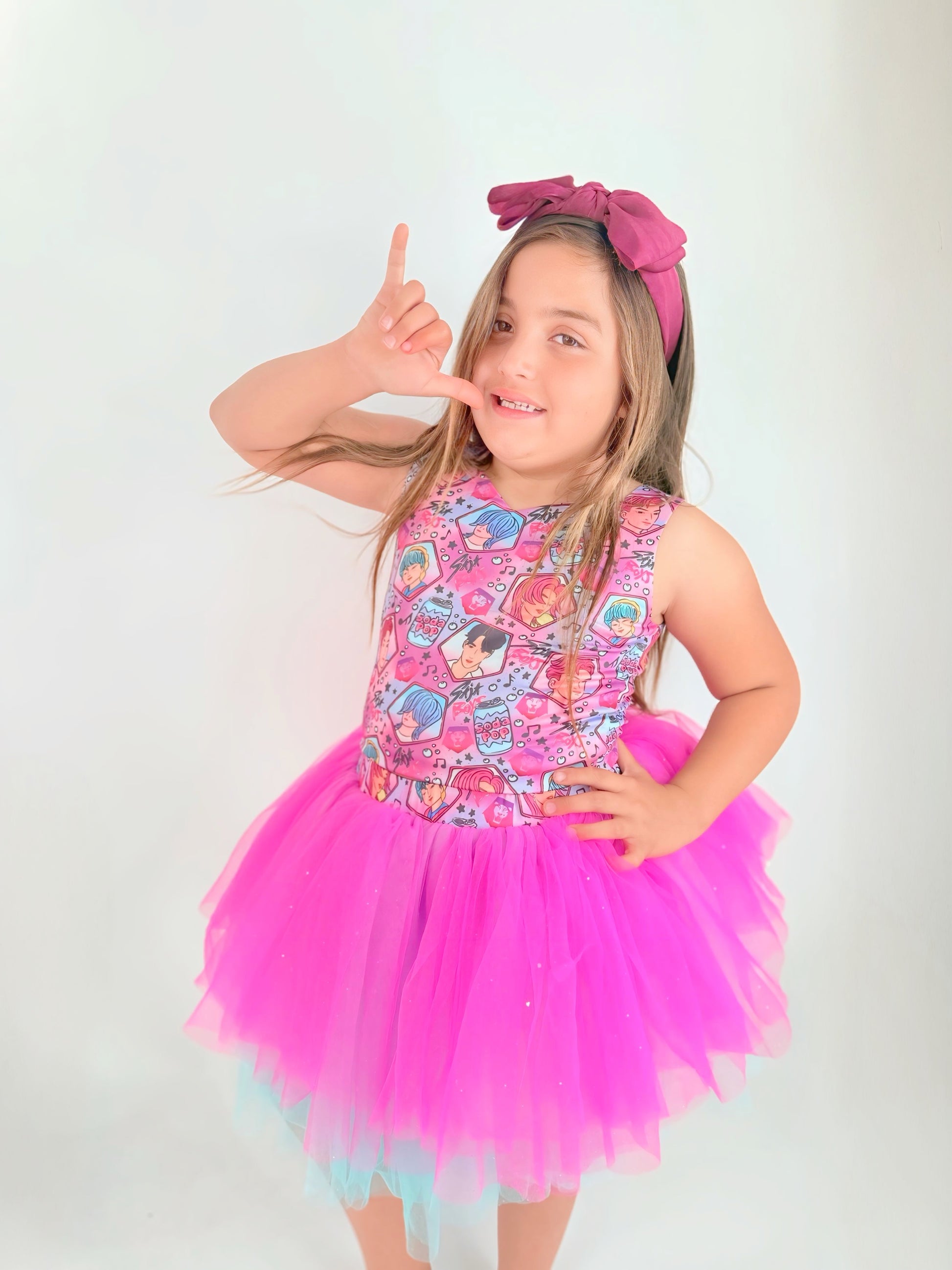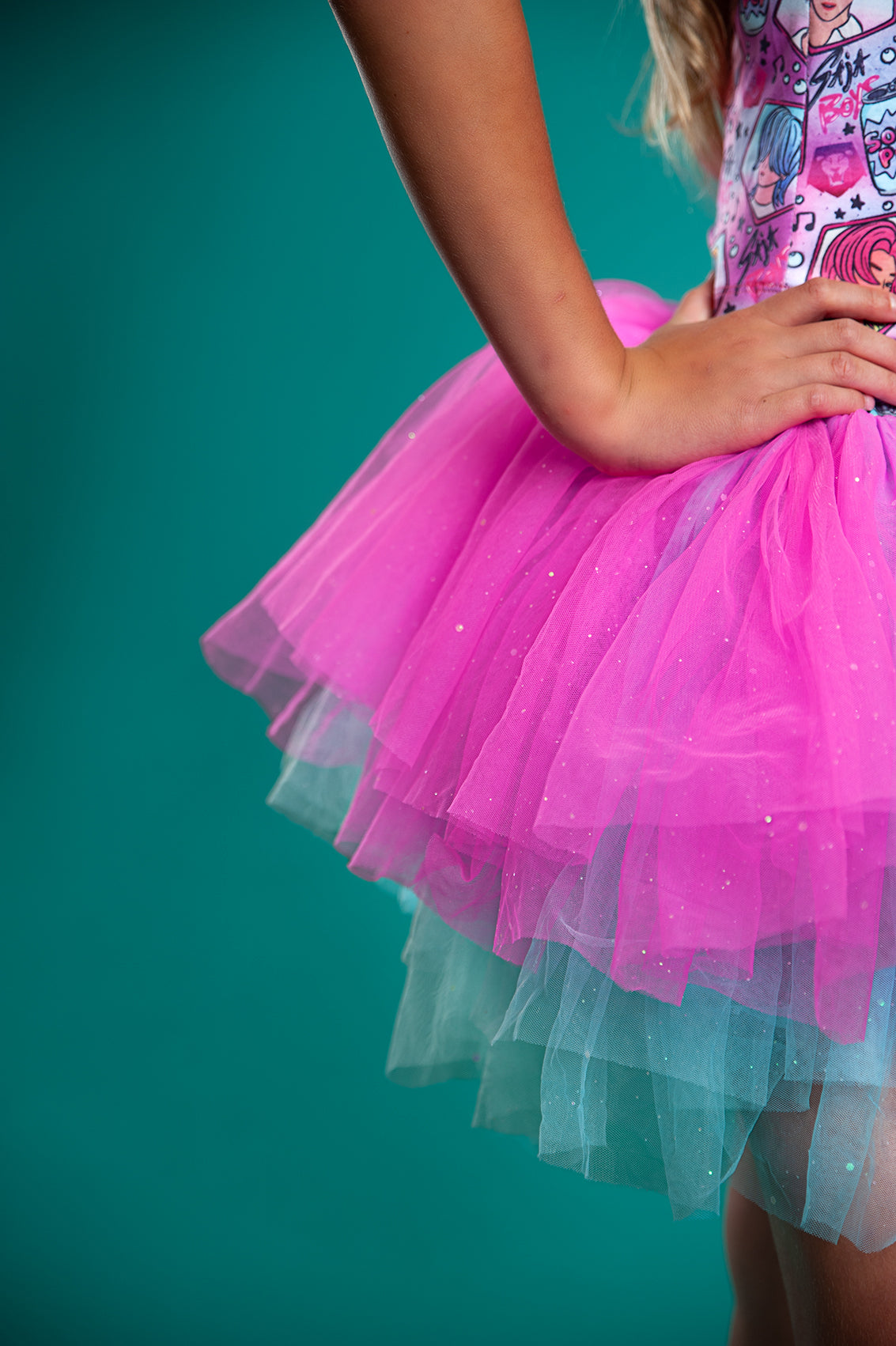 A voluminous tutu skirt crafted from multiple layers of high-quality, soft tulle with printed glitter (no shedding). The elastic waistband ensures a comfortable fit, and soft shorts are included underneath for full coverage and ease of movement.